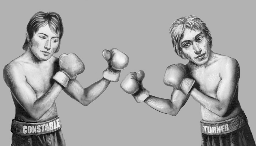 Знаменитый пример противостояния связан с выставкой в Королевской Академии в 1832 г., когда они показали свои работы по соседству. Для создания яркого рисунка Констеблу потребовалось 15 лет. Рядом висел серый морской пейзаж Тернера, созданный за несколько часов. В последний день перед открытием выставки художникам разрешили добавить к своим работам последние штрихи. Тернер заметил, что его спокойный пейзаж выглядит слишком тусклым в сравнении с картиной Констебла. Он достал краски и положил небольшой алый мазок, напоминавший буй, а затем ушел, не проронив ни слова. Быстрый и точный штрих завершил картину. После этого работа Констебла начала казаться перегруженной. Последним своим действием Тернер как бы сказал: «Чем меньше, тем лучше». В тот момент Констебл находился в другой галерее. Вернувшись и метнув взгляд на картину соперника, он прошептал: «Тернер был здесь и сделал свой выстрел». И с того дня Констебл начал мстить конкуренту – отныне он часто помещал фигуру человека в красном на дальнем плане своих картин.