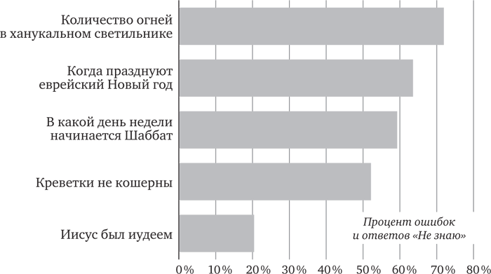 Это невежество не взаимно. На простые вопросы о христианских праздниках и традициях евреи отвечают почти так же хорошо, как и сами христиане. Более того, в 2010 г. в Исследовательском центре Пью сообщили, что с заданием, в которое вошли 32 вопроса общего характера на тему религии, евреи справились лучше, чем христиане[181]. Среди испытуемых самыми религиозно подкованными оказались атеисты и агностики.