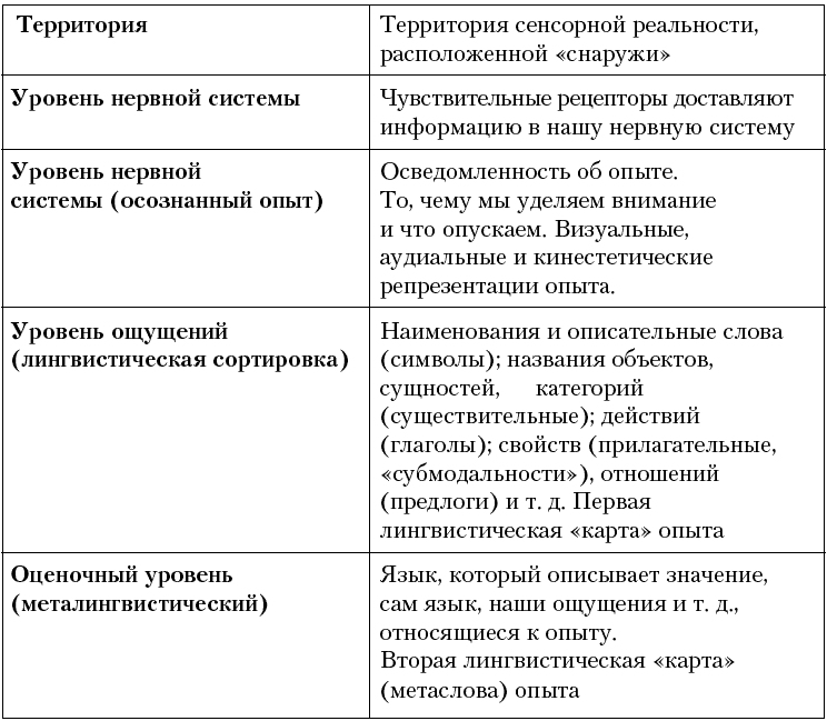 Слова внутри нас выполняют функцию символов сенсорных репрезентаций, а сенсорные репрезентации выполняют функцию символов реального опыта. Таким образом, если мы начинаем с опыта (территории), наши визуальные, аудиальные и кинестетические репрезентации выполняют функцию нервной «карты» опыта. Затем основанные на ощущениях слова («приятный день на пляже») создают базовую лингвистическую «карту» нервной «карты». Учитывая способ работы нашего сознания, мы затем можем использовать абстрактные понятия («удовольствие», «комфорт») в качестве лингвистической «карты» более высокого уровня по отношению к исходной лингвистической «карте» и т. д.
