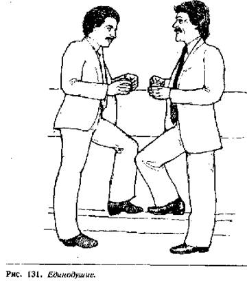 Если вы хотите установить полное взаимопонимание со своим подчиненным и создать непринужденную атмосферу, единственное, что вам нужно сделать, это скопировать его позу, и вы добьетесь цели. Аналогичным образом, перспективный, подающий надежды сотрудник фирмы может копировать жесты своего босса в попытке достигнуть взаимопонимания. Используя отзеркаливание, можно оказывать влияние на результаты вашей беседы с глазу на глаз с другим человеком. Копирование его жестов и позы поможет вам расположить этого человека — к себе, поскольку он видит, что вы понимаете и разделяете его точку зрения (рис. 132).
