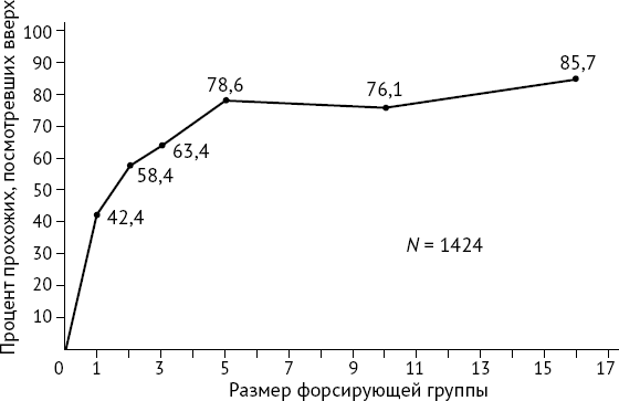 Рис. 23. Процент прохожих, посмотревших вверх, как функция размера форсирующей группы