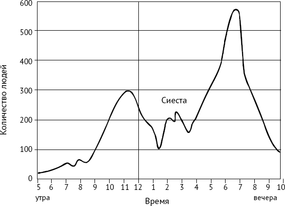 Дополнительные эмпирические наблюдения за изменением размера толпы дает исследование Кристофера Милларда (Millard, 1963), который изучал толпу на Пьяцца дель Палио. Ученый поминутно фиксировал количество входящих и выходящих людей и сумел построить график, отражающий количество людей на площади в течение дня (рис. 24). С помощью фотосъемки и подробных заметок Миллард зафиксировал также 1050 инцидентов, произошедших за период наблюдения – эту разновидность методики наблюдений социальные психологи вполне могут перенять для изучения толп; в ограниченном виде ее применял и Тернер (Turner, 1964).