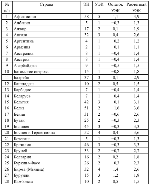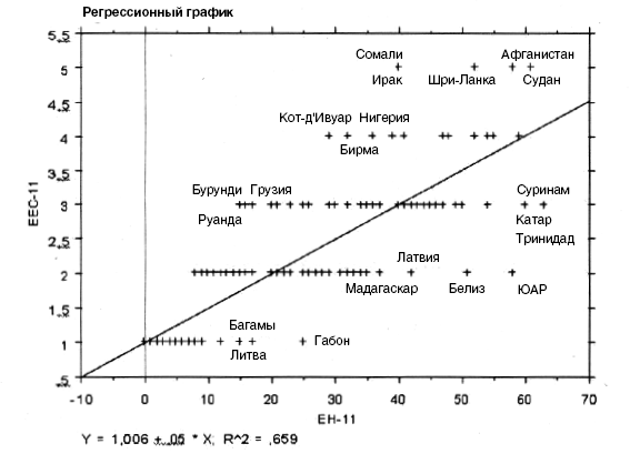 В странах, расположившихся вблизи линии регрессии, оценки уровня этнических конфликтов более или менее соотносятся с уровнями их этнической неоднородности. Такие страны строго поддерживают гипотезу о положительной связи между уровнем этнической неоднородности страны (ЭН) и ее оценкой по шкале уровня этнических конфликтов (УЭК).