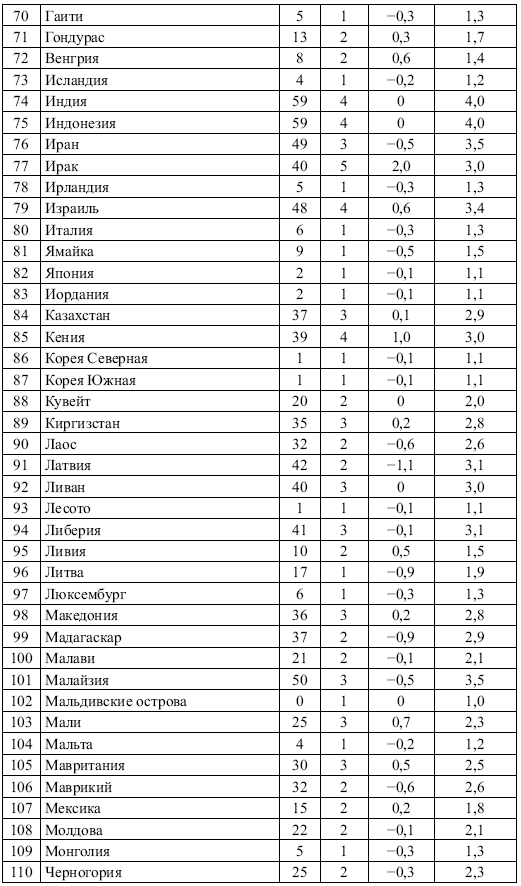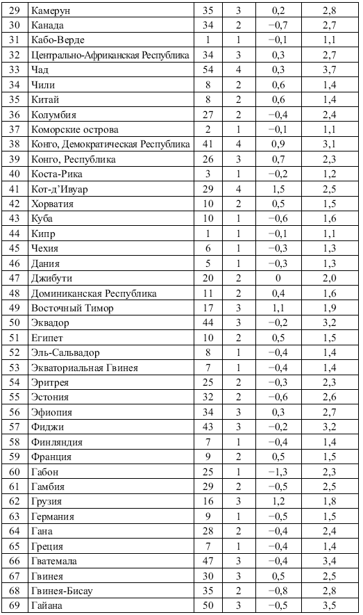 Рисунок 4.1 иллюстрирует высокую зависимость между ЭН и УЭК. Сильно отклоняется от линии регрессии сравнительно небольшое число стран. Некоторые из сильно отклоняющихся стран обозначены на рисунке. Для стран, расположившихся выше линии регрессии, оценки по шкале уровня этнического конфликта оказались выше ожидаемых на основании средней зависимости между ЭН и УЭК, а для стран, расположившихся ниже линии регрессии, – ниже ожидаемых. Было бы полезно узнать, почему некоторые страны так сильно отклоняются от линии регрессии и противоречат первой рабочей гипотезе.