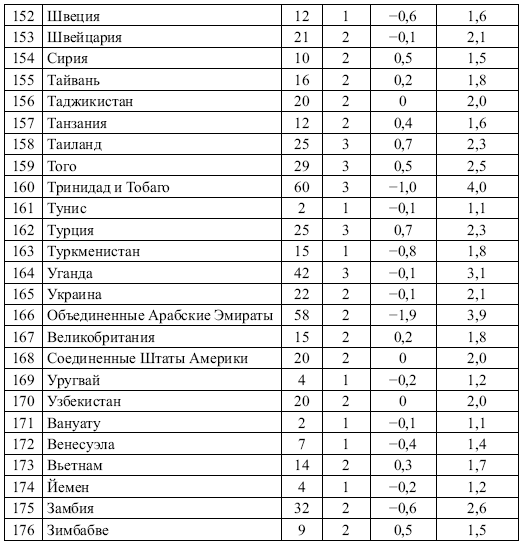 Мы можем видеть в таблице 3.3, что УЭК и ЭН, как и предполагалось, высоко коррелируют друг с другом. Объясняемая часть вариации УЭК достигает 66%. Согласно моей интерпретации, наилучшее теоретическое объяснение этого отношения дает наша развивавшаяся эволюционным путем предрасположенность к этническому фаворитизму. В конфликтных ситуациях люди склонны объединяться с другими членами своей этнической группы (этническими родственниками). Следовательно, чем сильнее популяция разделена в этническом отношении, тем больше конфликтов интересов имеет тенденцию канализироваться по этническим линиям. Нами была построена шкала оценок уровня этнических конфликтов (УЭК), предназначенная для измерения относительной значимости этнических конфликтов интересов в различных обществах, от незначительных конфликтов до насильственных этнических конфликтов, гражданских войн и геноцида. На рисунке 4.1 суммированы результаты регрессионного анализа УЭК на ЭН в группе из 176 стран, а в таблице 4.1 результаты детализированы по отдельным странам.