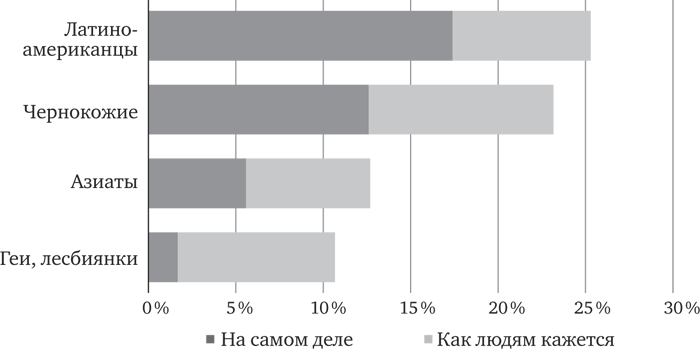 Представители поколения миллениума еще больше склонны все переоценивать. Испытуемые младше 30 лет полагают, что доля азиатов в США составляет 21 %, геев – 15 %[71]. Молодым, по сравнению с пожилыми, кажется, что азиатов больше в два раза, а геев – в полтора. Насчет же процентной доли латиноамериканцев и негров их взгляды практически совпадают.