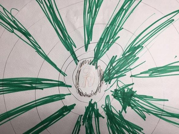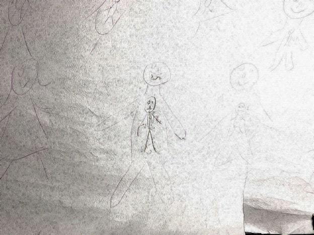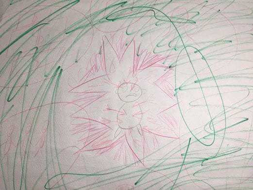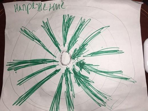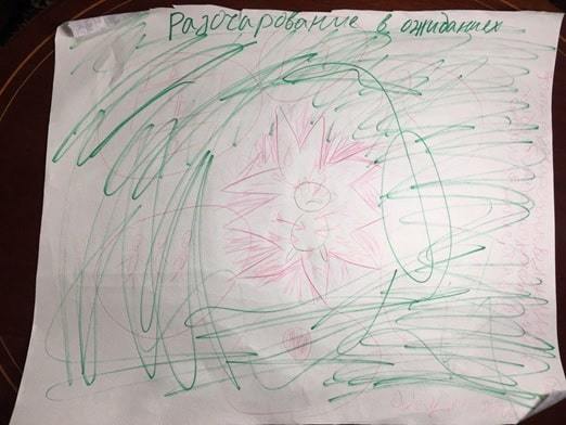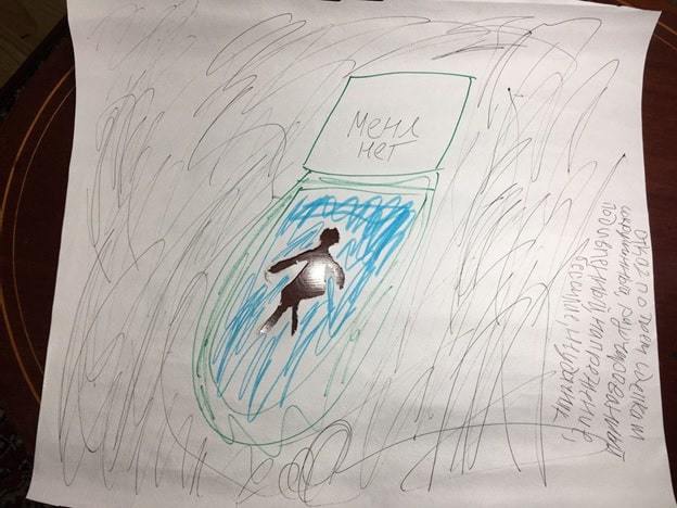 Сначала я нарисовал этот рисунок. Потом, когда я начал в него всматриваться, то я вспомнил, что я родился раньше срока, потому что папа заставил беременную маму толкать машину из снега. Я смотрел сериал про Чернобыль и там говорилось, что одна женщина была беременной во время аварии на ЧАЭС и что вся радиация впиталась в ее ребенка. Ее дочка умерла на 5 день после рождения. Ко мне пришла в голову мысль, что все то напряжение, которое моя мама испытала, когда она толкала машину вошло в меня, когда я был в ее утробе.