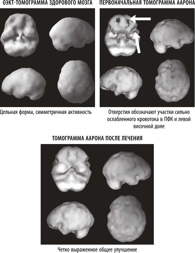 С учетом этой информации клиническая картина Аарона стала более ясной. Для борьбы с тревогой лечащий врач прописал ему два препарата, понижающие мозговую активность: ингибитор обратного захвата серотонина (лексапро) и бензодиазепин. Но поскольку его мозговая активность была уже понижена из-за травмы, то препараты ухудшили его состояние, вплоть до мыслей о самоубийстве. Нам нужно было привести его мозг в порядок, а не накладывать токсичную повязку. Когда вы повреждаете мозг, то сталкиваетесь с очевидной угрозой для жизни. К счастью, его мозг можно было вылечить. В ходе программы, исключавшей рецептурные препараты, которые причиняли ему вред (я не возражаю против лекарств, но эти были противопоказаны Аарону), мы прописали натуральные добавки для питания мозга и гипербарические кислородные процедуры для быстрого излечения. Через восемь дней он почувствовал себя гораздо лучше. Через полгода все симптомы исчезли, и последующее сканирование подтвердило значительное улучшение.