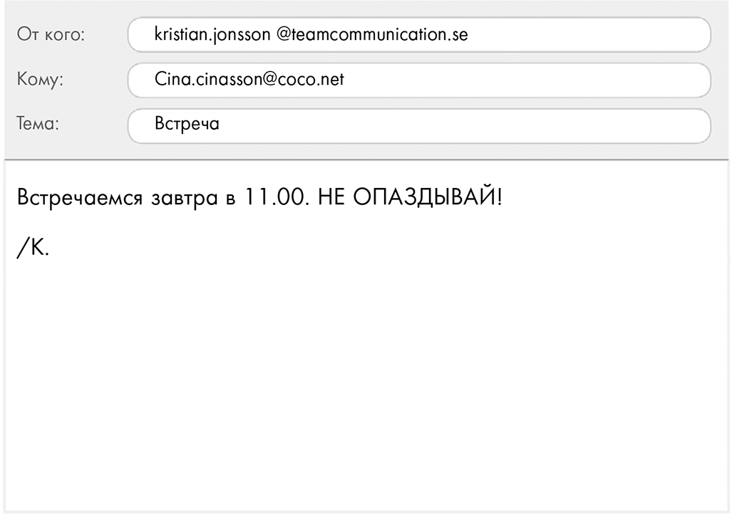 Что вы об этом думаете? Прописной шрифт указывает на то, что К. чем-то раздражен? Не обязательно. Может быть, он просто хочет подчеркнуть важность времени встречи. Может, он просто куда-то торопится. Но бесспорно, такое письмо может огорчить получателя. Хотя красный наверняка спокойно это переживет. Подумаешь, просто напоминание о встрече!