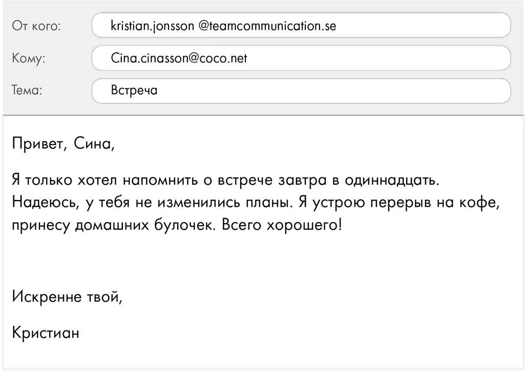 Более теплая и личная интонация. Вероятно, Кристиан как следует отредактировал это письмо, чтобы в нем не осталось никаких противоречий. Напоминание о встрече, уже давно запланированной, может кого-то слегка задеть, и отправитель хочет убедиться, что письмо не истолкуют превратно.