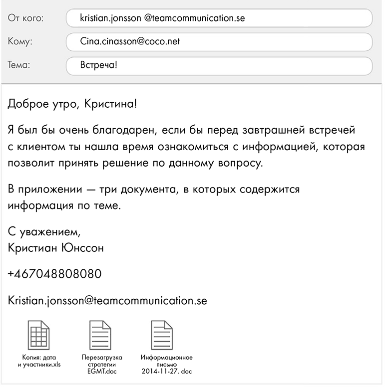 Если у вас нет никаких других способов общения, кроме электронной почты, – что ж, придется обходиться тем, что есть. Предположим, вы переписываетесь с одним из своих клиентов. Вы хотите должным образом подготовиться. Посмотрите внимательно, как выглядит электронное письмо. Базируется ли оно на фактах? Или, быть может, оно затрагивает какие-то личные темы? Письмо краткое и сжатое? Или оно продиктовано сиюминутным настроением? Все эти маленькие штрихи – важные сигналы, которые вы можете использовать себе во благо. Здесь, как и везде, существует множество исключений, но есть и общая схема, к которой следует присмотреться.