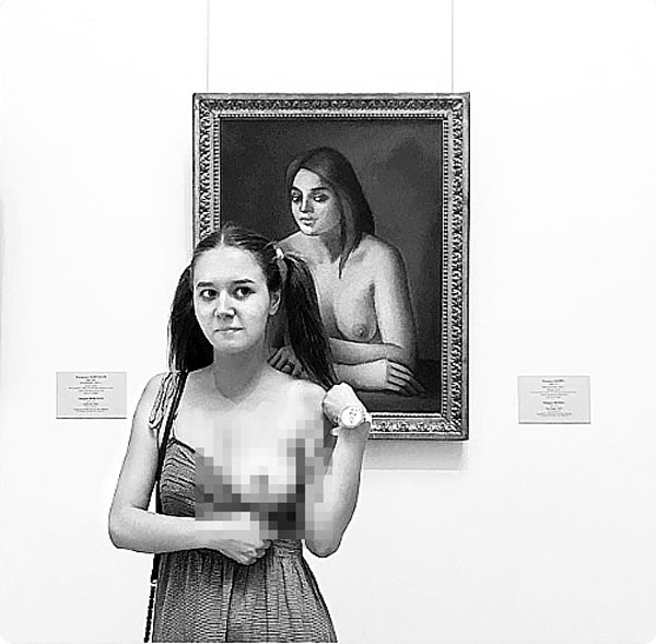 Не уверена вообще, что подобный поступок девушки, – это тема для глубокой рефлексии. Что вижу я? Девушка имитирует картину (практически одно лицо и грудь). Это красиво.