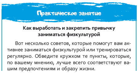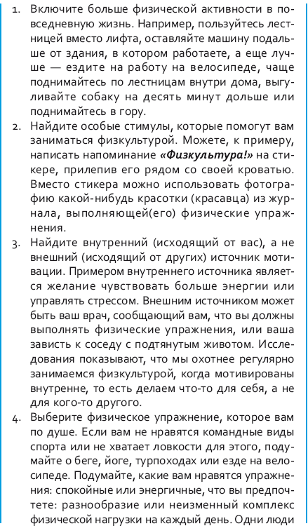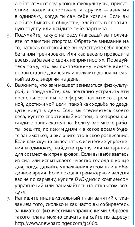 Есть и другие психологические факторы, мешающие заниматься физкультурой. Когда вы находитесь в стрессовом состоянии, физические упражнения могут показаться вам просто еще одной тяжелой задачей. Вы можете стесняться своего веса или стыдиться того, что не в форме, и вы вовсе не горите желанием испытывать такие чувства. Вы можете бояться ощутить дискомфорт и запыхаться. Возможно, утром вы страдаете от похмелья или испытываете слишком сильный аппетит для того, чтобы выделить время для тренировки. А в конце дня вам хочется просто посмотреть телевизор.