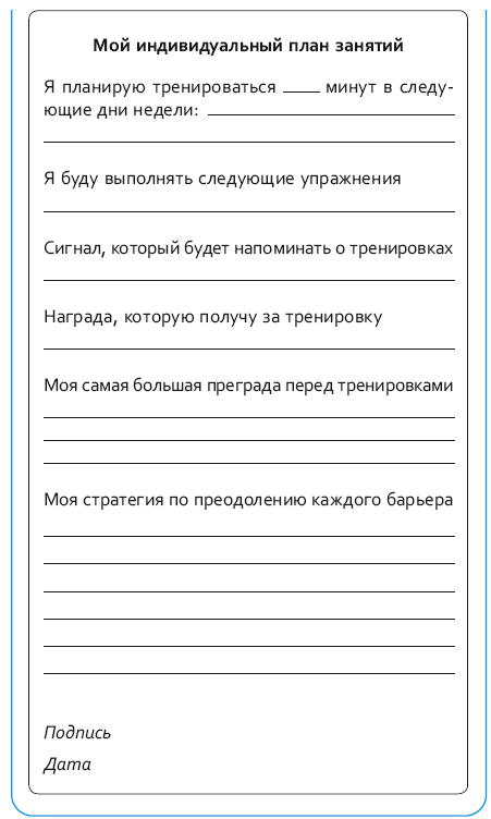 Из-за этих психологических, физических и эмоциональных факторов вам нетрудно найти повод отказаться от физической нагрузки. Одних благих намерений недостаточно. Вы должны предпринять конкретные меры для осуществления этих желаний и составить план преодоления неизбежных препятствий.