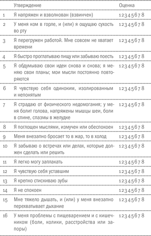 Небольшой опросник, разработанный канадскими исследователями Луизой Лемир, Рэжаном Тессье и Лиз Фийон позволяет быстро оценить, насколько остро человек реагирует на стрессовые факторы, которые присутствуют в его жизни. Шкала PSM 25 оценивает, как сильно стресс сказывается на соматических (то есть телесных), поведенческих и эмоциональных реакциях. Ниже приведена русскоязычная версия шкалы [41].