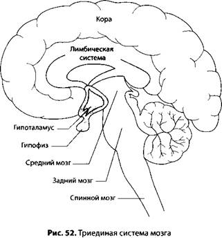 Я привожу здесь рисунок, показывающий, как выглядит мозг, чтобы рассмотреть второй механизм функциональных отклонений мозга при депрессии в дополнение к уже рассмотренному химическому механизму (рис. 52). Один отдел регулирует такие процессы, как частота дыхания и сердечный ритм. В него входит гипоталамус, который выделяет гормоны и отдает приказы автономной нервной системе. Если ваше кровяное давление резко снижается, вызывая компенсаторную реакцию на стресс, этот механизм приводится в действие гипоталамусом, средним мозгом и задним мозгом. Примерно такие же связи имеются у всех видов позвоночных животных.