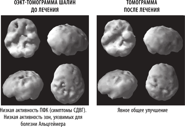 Ее ОЭКТ-томограмма выглядела ужасно. На ней были видны симптомы СДВГ с низкой активностью в лобных долях и в зонах первостепенной уязвимости для болезни Альцгеймера. Эта томограмма поразила ее, и в следующие два года она в точности следовала нашим предписаниям. Последующее сканирование показало резкое улучшение, что снижало риск будущих проблем. Что еще более важно, по ее словам, наступило явное улучшение в эффективности ее работы, домашних дел и отношений с людьми. Кроме того, она наконец смогла выбраться из подвала!