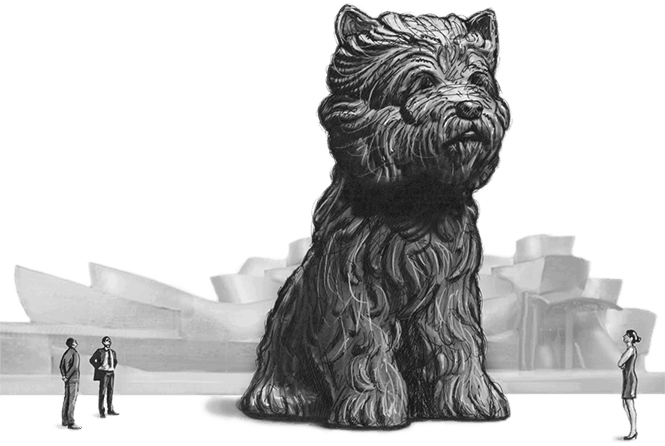 Скульптура «Щенок» представляла собой гигантского вест-хайленда из цветов. «Щенок» совмещал в себе две сентиментальные темы – цветы и щенки. Кунс заявлял, что безвкусный монстр представляет собой символ «любви, тепла и счастья». Скульптура возвышалась на высоту более 12 метров. Для ее создания в специальную стальную конструкцию поместили 23 тонны почвы и высадили туда 70 000 цветущих растений – красных, оранжевых, белых и розовых петуний, бегоний и хризантем. Скульптура была еще не завершена, и строители оставили площадку без присмотра. Подойдя ближе, я увидел, что тот человек, лихорадочно блестя глазами, пересаживает отдельные цветы с места на место.