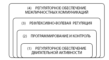 Регуляторные структуры обеспечения произвольной психической активности (упрощенно – регуляторная организация) на настоящий момент могут быть представлены в виде следующей уровневой системы (от более глубоких, нижележащих, к верхним, все более рефлексивным и социокультурно определяемым структурам) (рис. 5.3).