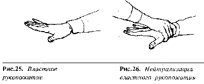 Существует несколько способов обращения с доминантным рукопожатием. Вы можете пользоваться описанным выше способом, основанным на цепочке шагов, но иногда его трудно применять, т. к. обычно рука автора жеста бывает жесткой и напряженной, что не позволяет провести такой маневр. Очень простой способ — обхватить руку человека сверху за запястье и затем встряхнуть ее (рис. 26). При таком способе вы становитесь хозяином положения, т. к. берете верх над рукой другого человека, а так как это может сбить с толку человека с властными намерениями, мы рекомендуем использовать это рукопожатие с определенными мерами предосторожности.
