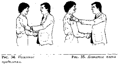 Прикосновение к плечу (рис. 35) или к предплечью (рис. 34) затрагивает особо интимную зону и может привести к сближению или прикосновению тел. Это возможно только между людьми, испытывающими особо эмоциональный подъем в момент пожатия. Если испытываемое чувство не является обоюдным, или если инициатор не имеет особых оснований для приветствия с применением обеих рук, то реципиент может почувствовать недоверие или подозрительность относительно намерений инициатора. Часто можно видеть, как политические деятели приветствуют своих избирателей с помощью этого жеста, или агенты по продаже приветствуют своих клиентов с помощью обеих рук, не осознавая, что это означает для них политическое самоубийство или загубленную сделку.