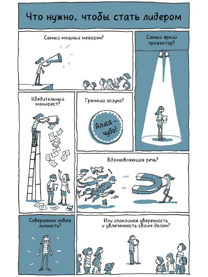 НАЙДИ РОЛЕВУЮ МОДЕЛЬ. Сколько бы раз я ни повторяла, что тихони могут быть лидерами, без реального примера все это пустые слова. Подумай, есть ли в твоем окружении сильный лидер с темпераментом, похожим на твой. Возможно, это кто-то из знакомых или известный человек, которым ты восхищаешься издалека. Ты поймешь, что нет ничего невозможного в том, чтобы вести людей за собой! А если почувствуешь неуверенность, можешь даже мысленно призвать на помощь своего кумира.