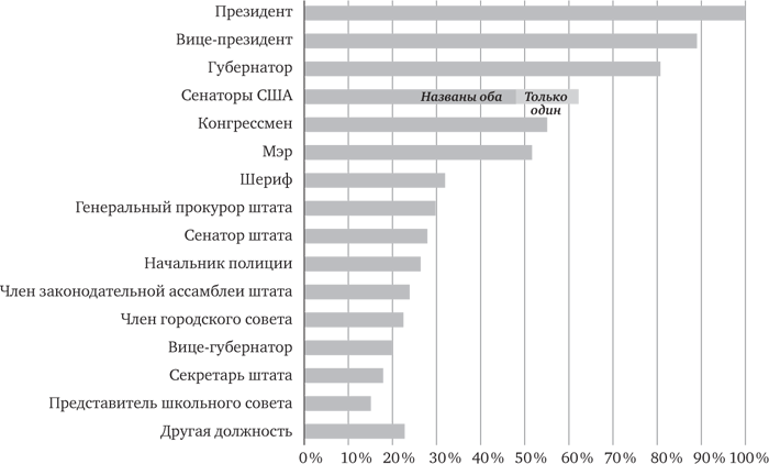 Президента, естественно, назвали все. Имя вице-президента смогли вспомнить 89 % (больше, чем сообщается в некоторых исследованиях)[110]. Хотя бы одного сенатора от своего штата назвали 62 %. Обоих сенаторов – чуть меньше половины. Конгрессмена от своего округа – 55 %.