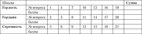 Просуммируйте результат по каждой из трех строк и определите свой вариант — он выше или ниже средних показателей: гордость — 20–41 балл; гордыня — 14–27 баллов; скромность — 14–27 баллов.