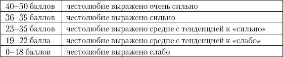 Определение результата. За каждый ответ да вы получаете по одному баллу. Набранная сумма баллов показывает степень вашего честолюбия: от 0 до 5 баллов — низкое, от 6 до 11 баллов — среднее, от 12 баллов и выше — высокое.