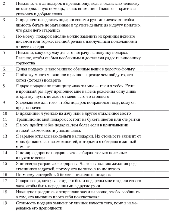 Ключ. За положительные ответы по пунктам 1, 5, 7, 9, 13, 15 начисляется по 3 балла, за положительные ответы по пунктам 2, 3, 14, 19 — по 2 балла, за положительные ответы по пунктам 4, 6, 8, 10, 11, 12, 16, 17, 18 — по 1 баллу. Подсчитывается набранная сумма баллов. Чем она меньше, тем больше выражена у вас жадность.