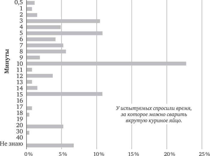 Если на эффект Даннинга – Крюгера понадобится хороший пример, взгляните, как на практике выглядят знания о приготовлении пищи и ведении домашнего хозяйства. Все мы немного в этом разбираемся, а те, кто по-настоящему находится в неведении, обычно и не подозревают степень своего невежества. Я попросил выборочную группу сказать, сколько времени нужно, чтобы сварить вкрутую куриное яйцо. Дать ответ, который хотя бы примерно соответствовал действительности (от 9 до 13 минут), затруднились две трети с лишним.