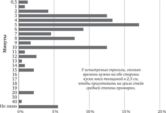 В другом вопросе спрашивалось, сколько времени нужно на обе стороны куска мяса толщиной в 2,5 см, чтобы приготовить на гриле стейк средней степени прожарки[275]. Рациональным ответом были бы пять минут. Но опять большинство ответило нерационально. В своих догадках насчет поджарки стейков, как и варки яиц, испытуемые чаще не доходили до нужной временной отметки, чем заходили за нее. Может, их предположения опираются на обширный опыт готовки в микроволновой печи?