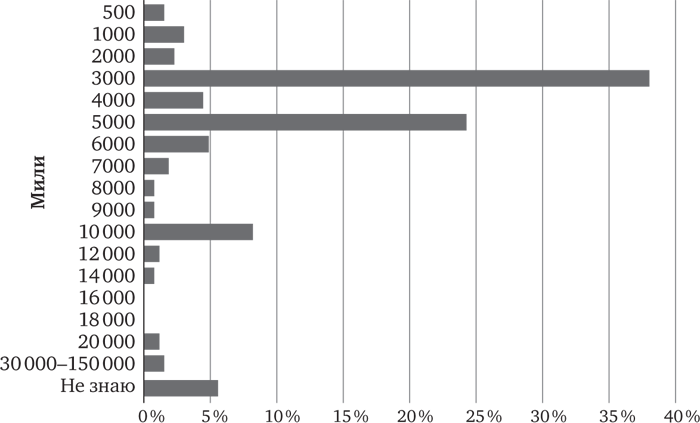 А вот на этот вопрос по машинам, мне казалось, ответить будет проще: «Примерно как часто нужно менять машинное масло?» Вопрос многовариантный, и ответы варьировались от «каждых пятисот миль» до «каждых двухсот тысяч миль». Самым популярным вариантом, бесспорно, оказались «каждые три тысячи миль», поскольку выбрали его 38 %[281].
