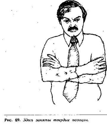 Продавцам следует проанализировать ситуацию, когда они видят, что покупатель сделал этот жест, и посмотреть, правильно ли они ведут переговоры. Если жест, с применением вертикально поставленных больших пальцев, появился в конце презентации товара, и если он сопровождается рядом других положительных жестов со стороны покупателя, то агент по продаже может спокойно завершать презентацию и вести речь о заказе. Если же в конце презентации покупатель принимает позу скрещенных рук со сжатыми кулаками (рис. 68) и делает совершенно безучастное лицо, спрашивать о заказе не следует, иначе могут быть трагические последствия. Вместо этого лучше вернуться к презентации товара и задать несколько вопросов, чтобы выяснить, в чем заключаются возражения покупателя. В переговорах о продаже очень трудно заставить покупателя изменить свое решение, если он произнес: «Нет». Умение понимать язык телодвижений позволяет вам видеть, что человек принял негативное решение до того, как он произнесет его, и это дает вам возможность и время изменить ход дела.