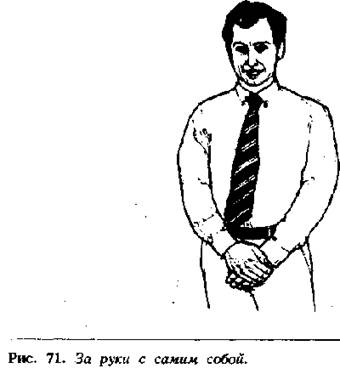 Социальный статус оказывает влияние на характер жеста, связанного со скрещиванием рук. Человек, занимающий более высокое социальное положение, может подчеркнуть свое превосходство тем, что будет постоянно держать руки скрещенными в присутствии людей, только что ему представленных. Допустим, что на официальном приеме главному управляющему только что представили несколько новых сотрудников, с которыми он ранее не был знаком. Поприветствовав их доминантным рукопожатием, он отодвигается от них на расстояние социальной зоны, а руки держит за спиной, заложив их в позу, характерную для начальника (рис. 42), или держит одну руку в кармане. Он держит руки скрещенными совсем не потому, что испытывает нервозность. Новые члены компании, с другой стороны, поздоровавшись за руку с боссом, примут позу полностью или частично скрещенных рук, потому что они находятся в присутствии высокопоставленного лица. И главный управляющий, и новые сотрудники чувствуют себя удобно, выполняя те или иные жесты, т. к. каждый демонстрирует ими свой социальный статус относительно другого. Но что происходит в случае, если главный управляющий знакомится с молодым, перспективным руководителем отдела, который даже может претендовать на то, что он по положению не менее важен, чем главный управляющий. По всей вероятности, после того, как оба обменяются властным рукопожатием, молодой администратор сложит руки на груди, поставив большие пальцы вертикально (рис. 70). Этот оборонительный жест является модификацией жеста, в котором оба больших пальца вытянутых горизонтально вперед рук поставлены вверх, что указывает на уверенность и самообладание человека. Этот жест применялся Генри Уинклсером в телесериале «Счастливые дни». Когда мы поднимаем большие пальцы вверх, мы показываем, что чувствуем себя уверенно, а скрещенные руки дают ощущение защищенности.
