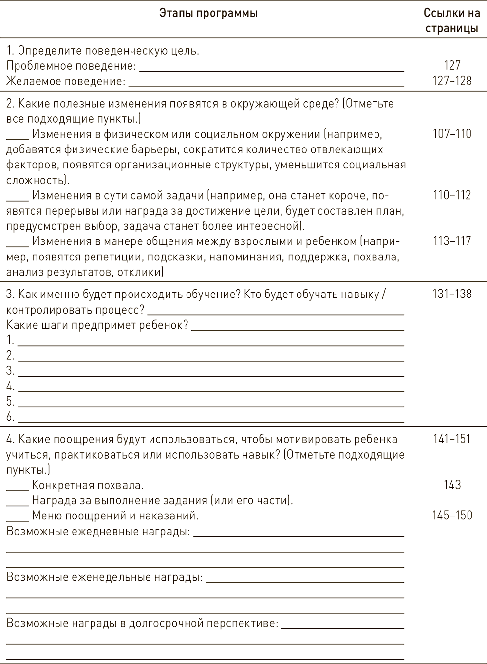 Опросники похожи на оценочную шкалу, которую вы заполняли в главе 2. Но на этот раз мы попросим указать, насколько хорошо или часто ребенок демонстрирует описанное поведение. Благодаря этому вы узнаете, стоит ли ограничиться общими рекомендациями или необходимо разработать полномасштабный план коррекционной работы. Если вы решите создать свой план, можете использовать все идеи из глав 5–8. Мы очень любим проверочные листы и даем вам один общий, чтобы вспомнить все элементы, которые необходимо проанализировать, создавая план работы над определенной проблемой (табл. 7.4). Чтобы вы могли освежить в памяти значение какого-либо из пунктов проверочного листа, мы указали, в какой части книги о каждом из них идет речь.
