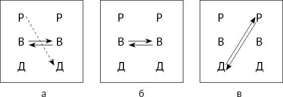 Штирлиц добился этого с помощью манипуляции, разыгранной в три приема. Начал он с внезапного обращения («коротко стукнул и, не дожидаясь ответа, вошел к Рольфу») с вопросом, подтекстом которого было подшучивание, намек на трусость, испытываемое им чувство страха. Сам вопрос (без подтекста) можно отнести к трансакции типа «Коллега» (обмен информацией). Но подтекст соответствует скрытой Р – – ? Д трансакции «Босс». Соответствующие трансакции изображены на рис. 19, а.