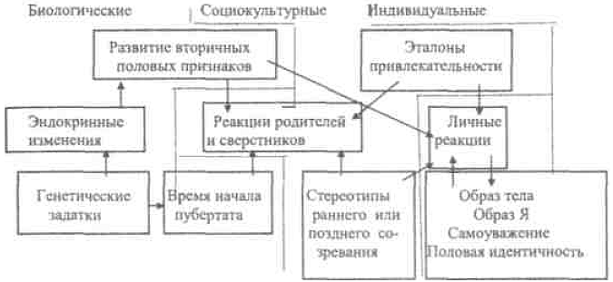 Схема 3. Гипотетически важные связи между пубертатными изменениями и психологическими реакциями (Питерсон и Тейлор, 1980).