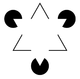 Однако эти треугольники и круги существуют только в вашей голове. На странице расположены лишь отдельные неполные части: три смотрящие наружу стрелки и три незаконченных круга, напоминающих тройку голодных пакманов. Наш мозг охотно заполняет пустоты и порождает иллюзию цельных фигур. Вырезанные участки кругов вместе с пространством между стрелками создают сильное впечатление, что на рисунке имеется перевернутый вверх ногами треугольник без контура, который частично закрывает собой нижний треугольник и сектора кругов. Самое поразительное в этой иллюзии – то, что, даже зная, что бумага вся одного цвета и никакого треугольника там нет, вы смутно «видите» его края, как будто по цвету он белее белого. И только при пристальном рассматривании края исчезают, и вы видите пустые места там, где они и должны были быть.