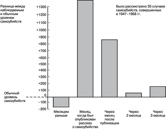 Филлипс внимательно изучил статистические данные о самоубийствах в Соединенных Штатах с 1947 по 1968 год. Он обнаружил, что в течение двух месяцев после каждой публикации на первых страницах газет рассказа о самоубийстве в среднем совершалось на 58 самоубийств больше, чем обычно. В определенном смысле каждое сообщение о самоубийстве убивало 58 человек, которые могли бы продолжать жить. Филлипс также выяснил, что тенденция самоубийств порождать самоубийства имеет место главным образом в тех областях, где первый случай самоубийства широко освещался в прессе; причем чем шире была огласка, которую получил данный случай, тем больше было число последующих самоубийств (рис. 4.5).