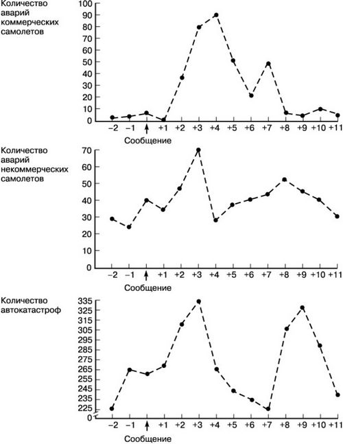 Было показано (Phillips, 1979), что сразу после волны публикаций, рассказывающих о самоубийствах, число людей, которые погибли во время авиакатастроф, увеличивается на 1000 %! Более того: увеличение числа смертей от несчастных случаев касается не только смертей в самолетах. Число дорожно-транспортных происшествий также резко увеличивается (Phillips, 1980). В чем же причина этого?