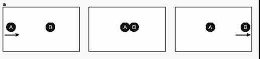 Рис 3 а. Перцептивная задача. Стимулы – три последовательно предъявляемых рисунка, изображающие движение шарика А по направлению к другому шарику В и последующее движение шарика В. Движения двух шариков были либо последовательными во времени и пространстве, либо имели небольшой разрыв в пространстве или во времени
