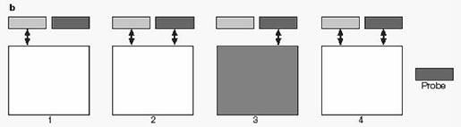 Рис 3 b. Логическая задача. Стимулы: последовательно предъявлялись четыре рисунка взаимодействия стимулов и подсказка ответа. Стрелки обозначают движение одного или двух окрашенных «выключателей». Один «выключатель» «включал свет» (окрашенный большой квадрат в третьем предъявлении). После наблюдения за этими четырьмя предъявлениями участники должны были сделать вывод, правильно ли подсказка указывает на «выключатель», который «включил свет»