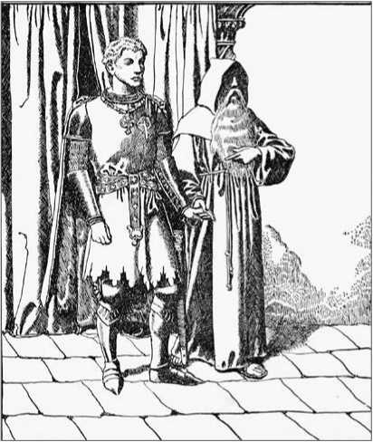 Когда Парцифалю исполнилось шестнадцать лет или около того, он, гуляя на холмах, вдруг услышал цокот копыт. Раньше он никогда ничего подобного не слышал и поэтому подумал, что к нему приближаются дьяволы. И тут появляются три рыцаря в сияющих латах, и он принимает их за ангелов и преклоняет колена, когда их предводитель, наследный принц, подъезжает к нему под звон колокольчиков, украшающих его облачение. Он великолепен, его одежды богато украшены, на шлеме колышутся перья, и вот какой-то деревенский простофиля падает перед ним на колени и восклицает: «Господи, помилуй!»
