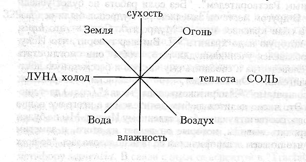 330 Помимо лунной влажности и земной природы соли, наиболее выдающимися ее качествами являются горечь и мудрость. Как в двойном quaternio элементов и качеств холодность является общим качеством земли и воды, так горечь и мудрость образуют пару противоположностей, между которыми расположено что-то третье. (См. Диаграмму.)