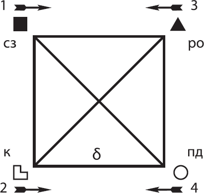 Для типа ИМ «Дон Кихот», который стал в этой книге традиционным примером, такой является квадра «дельта»: «Штирлиц» (1), «Достоевский» (2), «Гексли» (3), «Габен» (4) (рис. 12).
