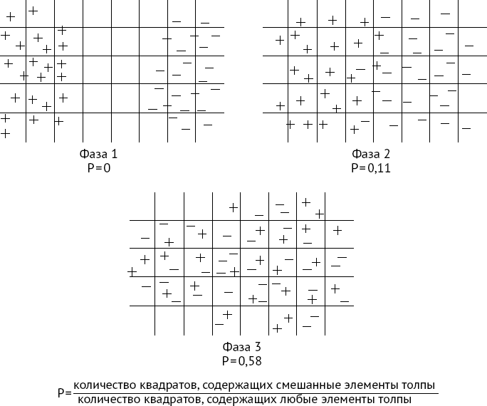 Чтобы провести количественную оценку, вполне можно измерить степень взаимопроникновения двух сторон в статистических терминах смешанных и несмешанных пробежек. А можно наложить палетку на фотографии, сделанные на разных фазах беспорядков, и определить, сколько квадратов получились смешанными, а сколько содержат несмешанные элементы, как показано на рис. 18.