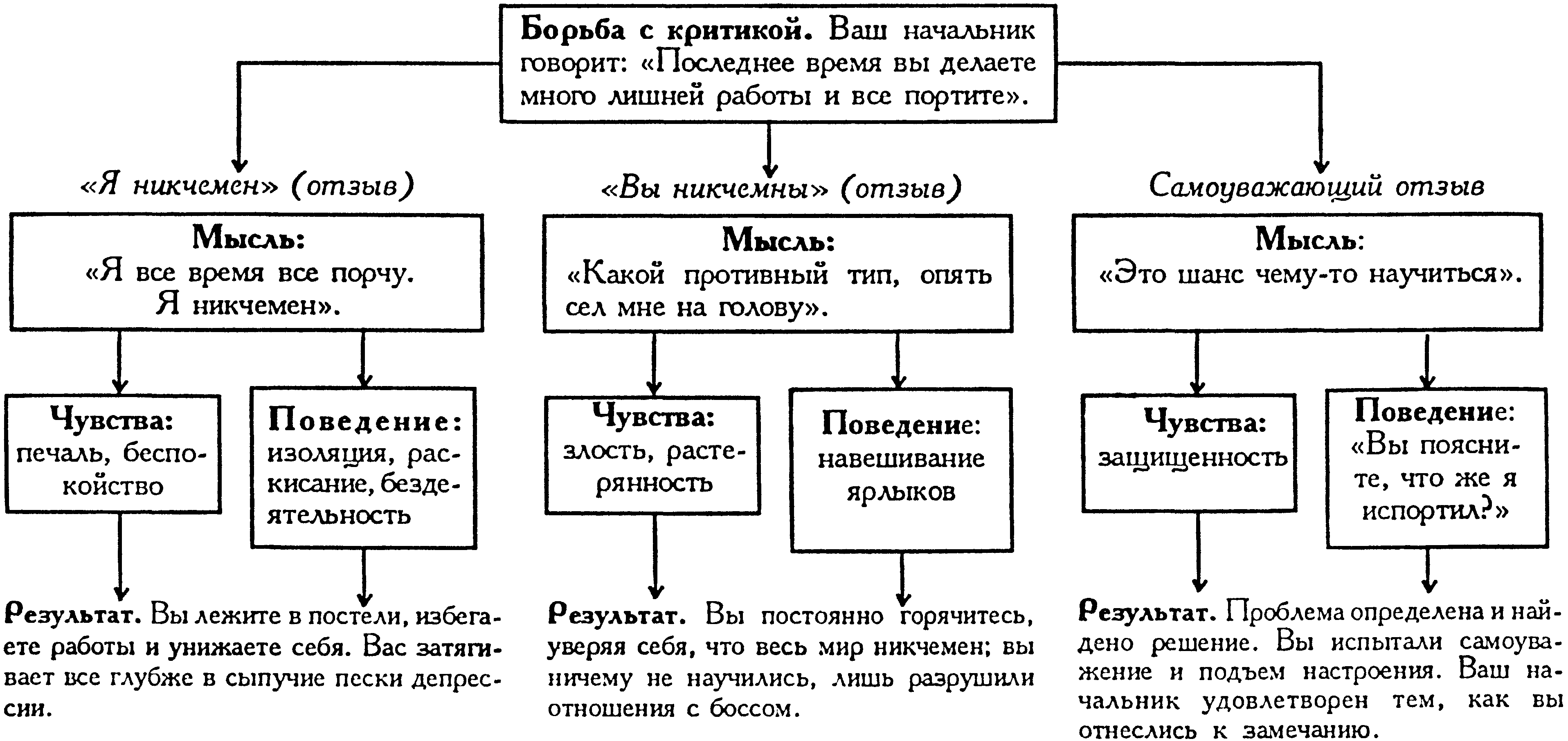 Многие люди, предрасположенные к депрессии, выбирают печальный путь. Они автоматически делают выводы, что критик прав, без какого-либо размышления совершается скачок: были правы — совершили ошибку. Далее подчеркивается важность критики и при этом допускается целая серия когнитивных ошибок. Общий вывод из единичных фактов, то есть жизнь состоит из сплошных ошибок. Ярлыки — я ни на что не годен. В результате когнитивных нарушений человек впадает в депрессию и ощущает потерю самоуважения. Отзывы на критику будут соответствовать внутренней направленности на поражение.