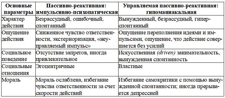 По существу, эти оба сравнения вполне понятны (и позже мы еще вернемся к состоянию навязчивой одержимости), но, наверное, связь с психопатическим состоянием является наиболее очевидной. В конечном счете, сущность защитного типа психопатии проявляется в импульсивной реактивности, в быстрой реактивности, позволяющей избежать рефлексии. А значит, не случайно, что преувеличения, часто — излишние преувеличения всех хорошо известных черт психопата, таких как отсутствие запретов, относительное бесстрашие или эгоцентризм, многословие, беспринципность, а также сама безрассудная импульсивность, — все эти черты можно найти у гипоманиакальной личности (табл. 4).
