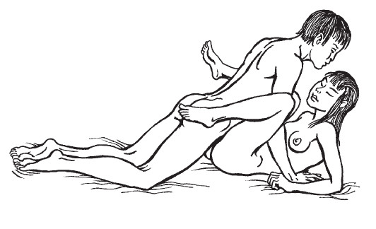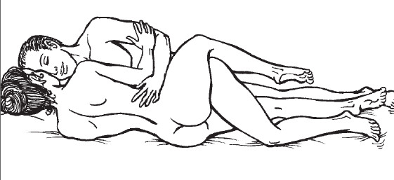 «Облегающий способ», когда женщина лежит на боку или на спине. В положении на боку мужчина лежит на левом боку, из-за чего женщина вынуждена лежать на правом, – правило, соблюдаемое чаще всего при соитии со всеми женщинами.